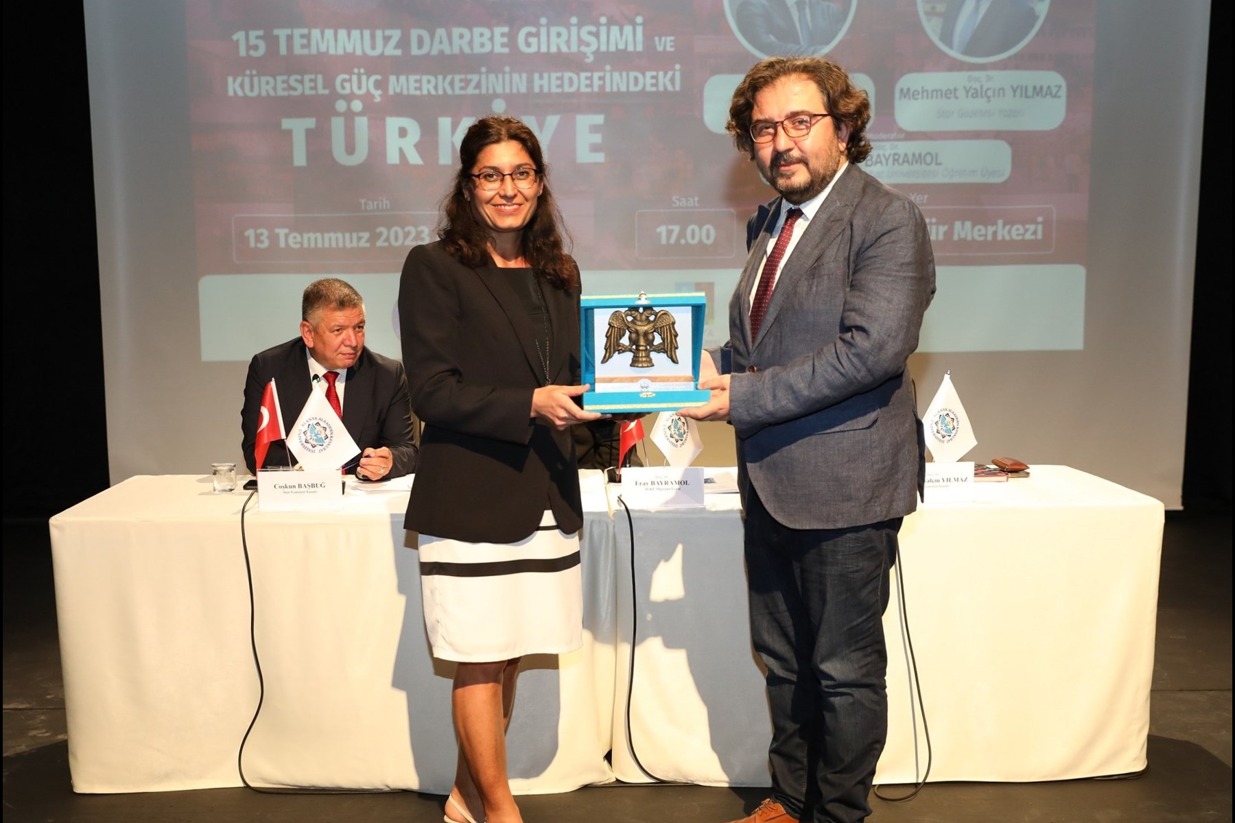 Star Gazetesi yazarı ve 15 Temmuz gecesi Batı medyasında yer alan haberleri analiz eden “Batı Medyasında 15 Temmuz” kitabı ile tanınan İstanbul Üniversitesi Öğretim Üyesi Doç. Dr. Mehmet Yalçın Yılmaz, FETÖ’nün destekçilerini ve arkasındaki emperyalist güçleri tüm detaylarıyla anlattı. Müslüman-Türk milleti özelliklerinden birisinin güvenilir oluşumların içinde olmayı sevdiğini söyleyen Yılmaz, “FETÖ’nün ilk bakışta güvenilir göründüğü için insanların böyle bir ihanet yapacağı asla akıllarına gelmedi. Sonrasında yapının devlete sızmasıyla tehlike başladı. Milletin bu yapıya güven duyması küresel güçlerin dikkatini çekti ve örgüt tam olarak bu güçlere hizmete başladı. Türkiye’de darbelerden hiçbir zarar almayan FETÖ, 12 Eylül darbesinden sonra büyümesini çok hızlandırdı ve uluslararası zemine de yerleşti. Örgüte katılan çocuklarla birlikte aileler de bu örgüte katılmaya başladı. Bütün bu hikâye bize bu yapıların her yeri ele geçirmemesi gerektiğini öğretti. Sonrasında zaten ihanetle başlayan yapılaşma darbe girişiminde bulunmasıyla tamamen aşikâr oldu ve gerçekten bir terör örgütü olduğu da ortaya çıktı. 15 Temmuz’da biz ne yaşadık? Sorusunu her zaman kendimize sormamız ve buna göre yaşantımızı belirlememiz gerekiyor.” dedi. Yılmaz, 15 Temmuz gecesi yaşananların Batı dünyasında yakından takip edildiğini de anlatarak, “Küresel güçlerin desteğiyle güçlenen FETÖ aslında bir taşeron örgüttü. Sonuçta buna hep birlikte gördük ve böyle yapılara karşı nasıl davranılması gerektiğini en iyi şekilde anladık. 15 Temmuz gecesini Batı tüm dikkatiyle takip etti. Başarılı olması durumunda Batı, Türkiye’ye yaptırmak istediği her şeyi artık bu örgüt sayesinde yaptıracaktı. Hamdolsun Milletimiz buna izin vermedi. Zaten 15 Temmuz gecesi milletimizin azmi ve kararlığı Batı’yı şok etti. Yurt dışındaki arkadaşlarımız milletimizin gösterdiği bu azmi yürekten kutluyorlar. Birçok arkadaşım, “Bu insanlar nasıl tankın önüne yattı, nasıl namluların ucuna göğüs gerdiler, inanılacak gibi değil’ diye soruyorlar. O arkadaşlarıma bunun asla anlatılamayacağını, ülkemize gelip Milletimizin, vatan ve bayrak sevgisinin nasıl olduğunu yaşayarak öğrenmeleri gerektiğini söylüyorum.” dedi. Konferansın ardından Güvenlik ve Terör Uzmanı, Emekli İstihbarat Albay Coşkun Başbuğ, Star Gazetesi Yazarı Doç. Dr. Mehmet Yalçın Yılmaz ve Konferansın Moderatörü ALKÜ Öğretim Üyesi Doç. Dr. Eray Bayramol’a plaket takdim edildi.