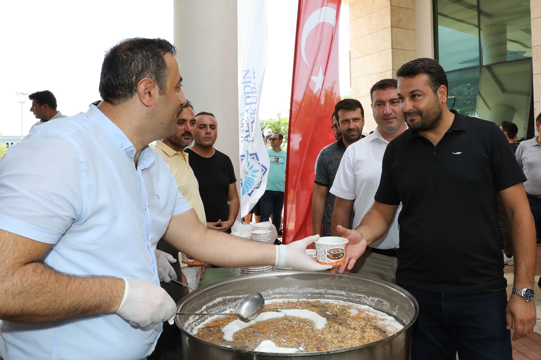 Alanya Alaaddin Keykubat Üniversitesinde (ALKÜ), Hicrî takvimin ilk ayı olan Muharrem ayı dolayısıyla Aşure dağıtım etkinliği gerçekleştirildi. Birliğin, beraberliğin, bolluk ve bereketin simgesi olan Aşure Günü kapsamında gerçekleştirilen ikram programı cuma namazı çıkışında Eğitim Fakültesi bahçesinde düzenlendi. Eğitim Fakültesi bahçesinde yapılan etkinliğe, ALKÜ Rektörü Prof. Dr. Ekrem Kalan, Rektör Yardımcısı Prof. Dr. Erdoğan Aslan, Genel Sekreter Alper Özyürek, dekanlar, daire başkanları, akademik ve idari personel katıldı.