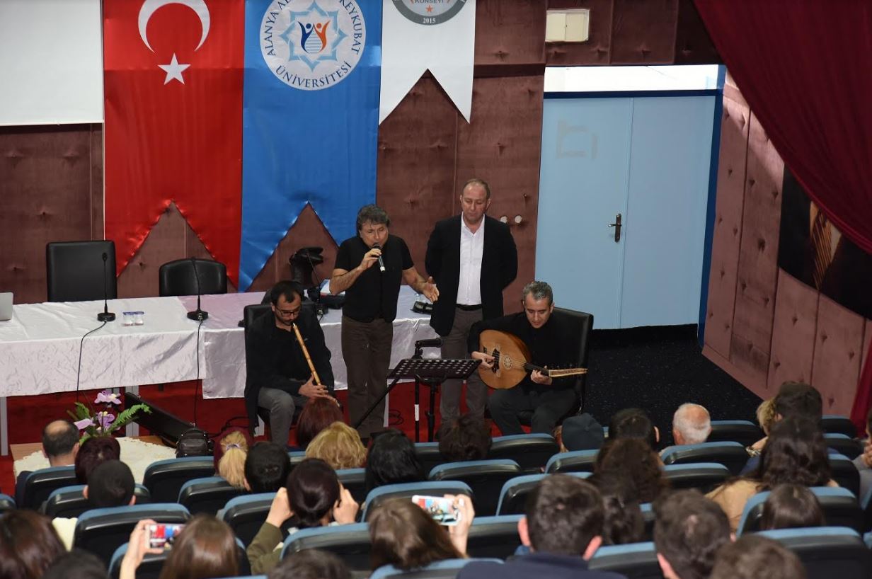 Trakya Üniversitesi Tıp Fakültesi Fizyoloji Ana Bilim Dalı Öğretim Üyesi Prof. Dr. Levent Öztürk ve Kültür Bakanlığı Edirne Devlet Türk Müziği Topluluğu Müdürü ve ses sanatçısı Fadıl Atik, ses sanatçısı Halil Erseven, udi ve sanat yönetmeni Murat Bağdatlı, Neyzen Muhammed Şükrü Fırat tarafından “Türk Müziği’nde Terapi Geleneği” konu başlığıyla gerçekleştirilen konferansa ALKÜ İşletme Fakültesi Dekan Yardımcısı Doç Dr. Kemal Vatansever, ALKÜ Sağlık Kültür ve Spor Daire Başkanı Hakan Bütün, Alanya Gönül Dostları Türk Müziği Korosu Üyeleri, akademisyenler ve öğrenciler katıldı.