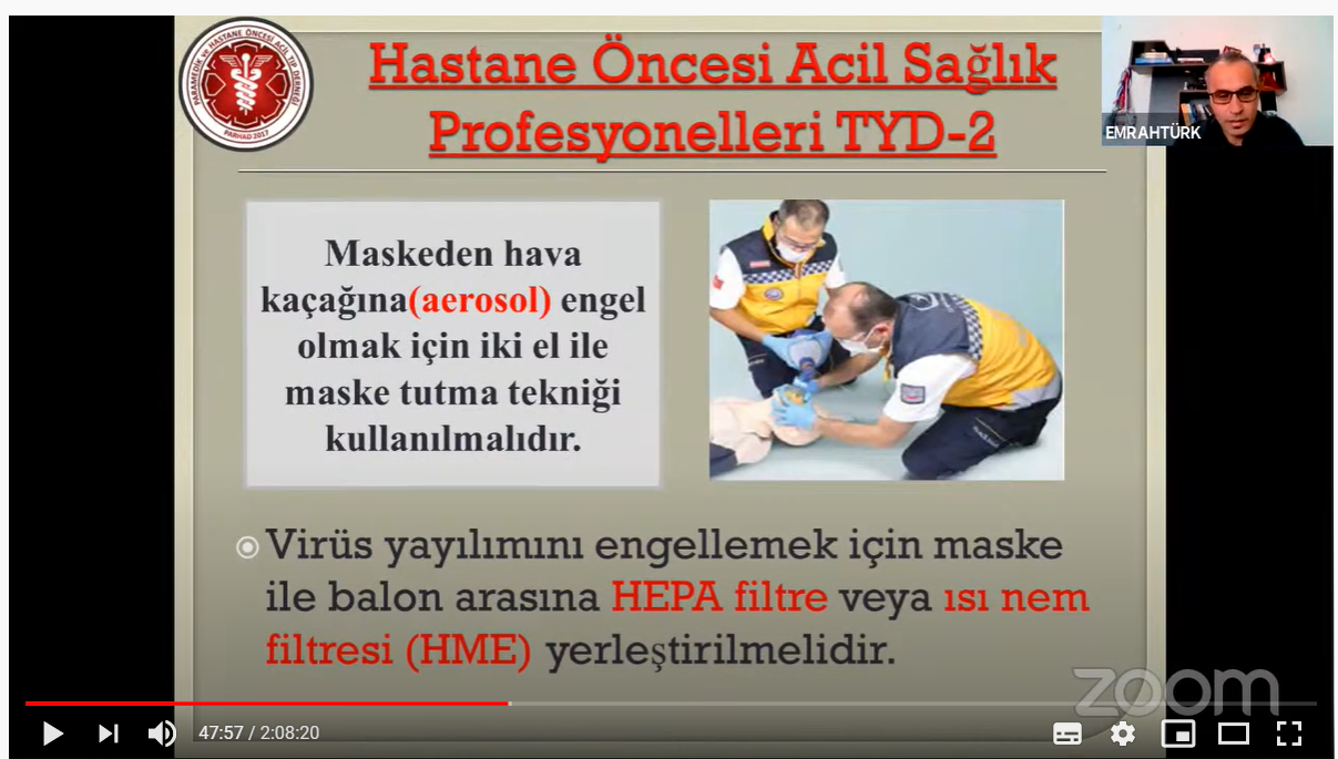 İlk olarak Paramedik Hasan Ali Güler, Covid 19 şüpheli veya pozitif hastanın hastane öncesi alanda değerlendirilmesindeki uygulama farklılıkları ve kişisel koruyucu ekipmanların kullanımı hakkında önemli bilgiler verdi. Ardından Paramedik Emrah Türk, temel ve ileri yaşam desteğinde hem halktan kurtarıcılar hem de sağlık profesyonelleri için dikkat edilmesi gereken önemli hususlara değindi. ATT İsmail Otlamaz ise Covid 19 şüpheli veya pozitif hastaların taşınması, sonrasında ambulans ve kullanılan malzemelerin temizliği, dezenfeksiyonunda kullanılacak ürünler ve kullanım şekilleri hakkında önerilerde bulundu. Katılımcı konuşmacılardan Uzman Emrah Bayraktar da Filyasyon ekiplerinin kurulumu, çalışma şekli ve pandemi sürecinde yeni kurulan İSDEM birimlerinin çalışmalarından bahsetti. Uzman Bayraktar Filyasyon ekiplerinin 24 saat çalıştıklarını, bu çalışmaların günlük olarak raporlandığı ve düzenli olarak Sağlık Bakanlığına bildirimlerinin yapıldığının altını çizdi. Paramedik Mustafa Enes Sarık ise Kredi Yurtlar Kurumu Yurtlarının Antalya da ikametgâhı olmayan temaslı ya da COVİD 19 pozitif olan hastalar ve izolasyonda sıkıntı yaşayan kalabalık aileler için kullanıldığını belirtti. Kurulan sahra hastanelerinde ise test işlemlerinin yapıldığı ve yine Kredi Yurtlar Kurumu Yurtlarında kalan bireylere sağlık hizmeti verildiğini aktardı.