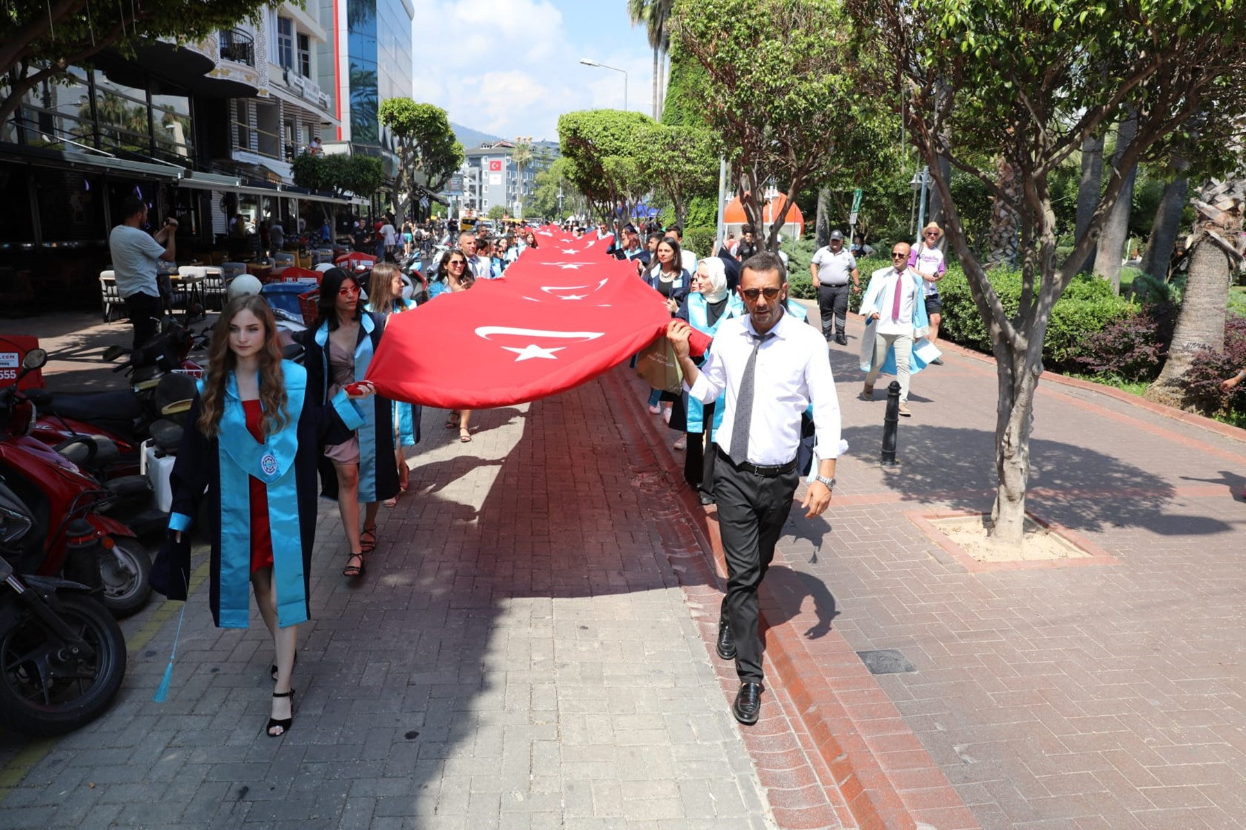 Alanya Alaaddin Keykubat Üniversitesi 2021-2022 Öğretim Yılı Mezuniyet Töreni öncesinde ALKÜ Rektörlüğü tarafından Atatürk Anıtı’nda Çelenk Sunma Töreni gerçekleştirildi. Törene, ALKÜ Rektörü Prof. Dr. Ekrem Kalan, Rektör Yardımcıları Prof. Dr. Erdoğan Aslan, Prof. Dr. Özgür Kasım Aydemir, Genel Sekreter Alper Özyürek, dekanlar ve öğrenciler katıldı. Tören kapsamında Atatürk Anıtı’na Rektör Prof. Dr. Ekrem Kalan tarafından çelenk sunuldu. Saygı duruşu ve İstiklal Marşı’nın söylemesinin ardından törene katılan öğrenciler ve akademisyenler tarafından Alanya’da mezuniyet yürüyüşü gerçekleştirildi. Türk Bayrağı eşliğinde Atatürk Anıtından başlayan kortej Kızılkule’de son buldu. Renkli görüntülerin yaşandığı kortejin sonunda Kızılkule önünde toplanan öğrenciler ve akademisyenlerin hatıra fotoğrafının çekilmesinin ardından yürüyüş son buldu. Hatıra fotoğrafının çekilmesinin ardından korteje katılan öğrenciler ve akademisyenler Konaklı Stadyumunda düzenlenen Mezuniyet Törenine katıldı.