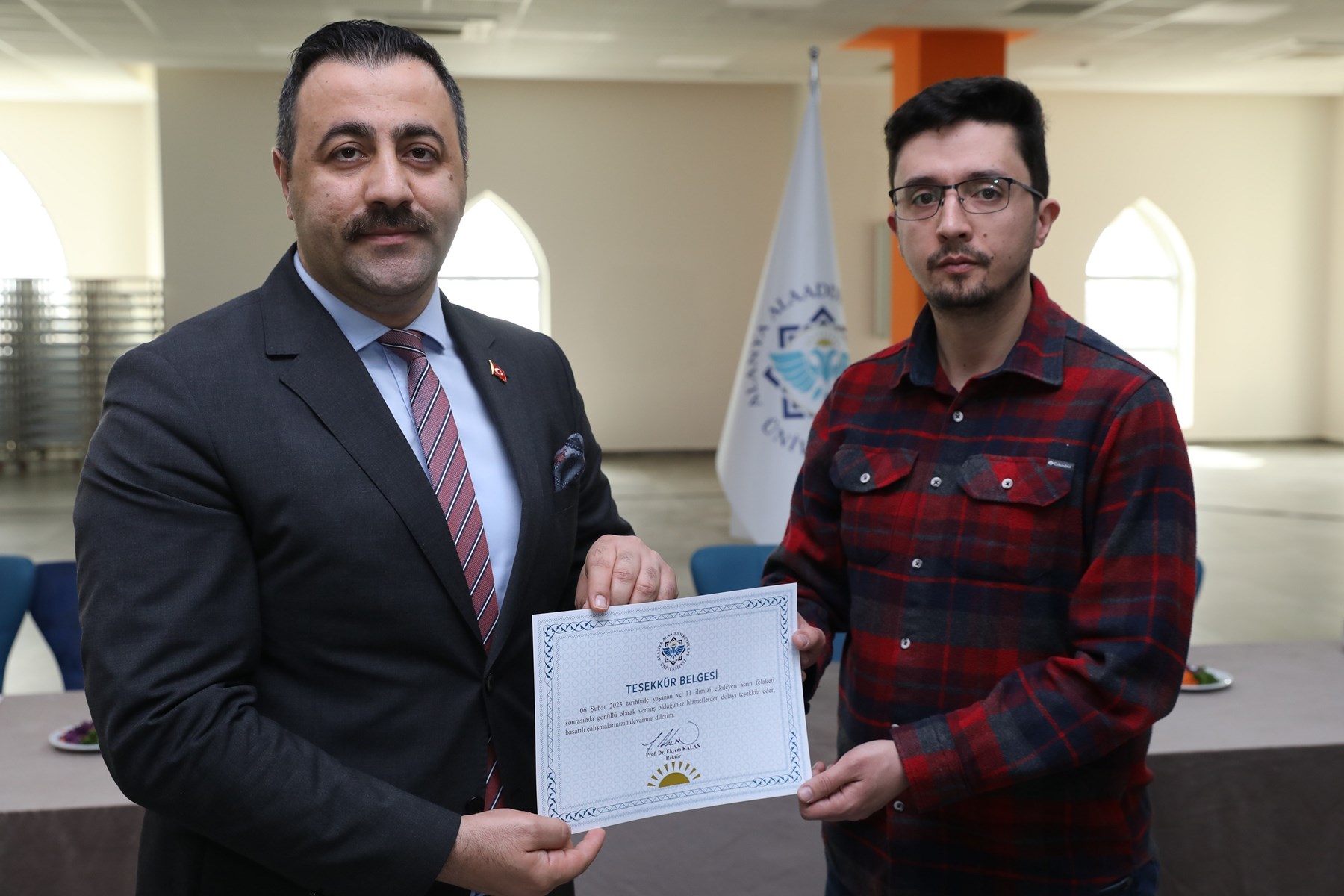 Kahramanmaraş merkezli gerçekleşen depremin ardından görev alan ALKÜ’lü gönüllü personel unutulmadı. Alanya Alaaddin Keykubat Üniversitesi (ALKÜ) Rektörü Prof. Dr. Ekrem Kalan, hem afet bölgesine giderek hem de deprem felaketinden etkilenen vatandaşlara yapılan yardımları Alanya’daki depremzedelere gönüllü olarak hizmet sunan personel ile Sağlık, Kültür ve Spor Daire Başkanlığının organizasyonu kapsamında öğle yemeğinde bir araya geldi. Yemeğin ardından ALKÜ Rektörü Kalan, depremin ilk gününden itibaren afet bölgesinde ve Alanya’da görev yapan gönüllü personele Teşekkür Belgesi takdim etti. Rektör Kalan, “Bu süreçte depremzedeler için gerek bağışlar noktasında gerekse yardımları depremzedelere ulaştırma noktasında destek olan ALKÜ ailesinin tüm paydaşlarına canı gönülden teşekkür ediyorum. ALKÜ’de maddi ve manevi sürece destek olmayan tek bir personelimiz yoktur.” dedi.