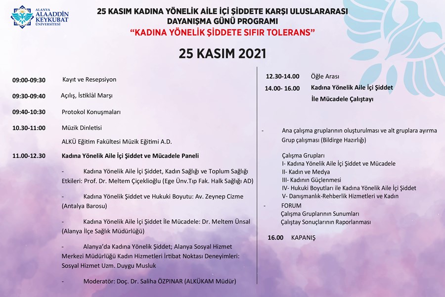 Alanya Alaaddin Keykubat Üniversitesi Kadın ve Aile Çalışmaları Uygulama ve Araştırma Merkezi (ALKÜKAM), kadına karşı şiddet kullanımının ortadan kaldırılması, kadınların bilgiye, yardım ve korunma hizmetlerinin ulaşılabilirliğinin artırılması, şiddetin nedenleri ve sonuçlarının ortaya çıkarılması amacıyla, 25 Kasım Kadına Yönelik Şiddetle Mücadele Günü kapsamında çeşitli etkinlikler düzenleyecek.