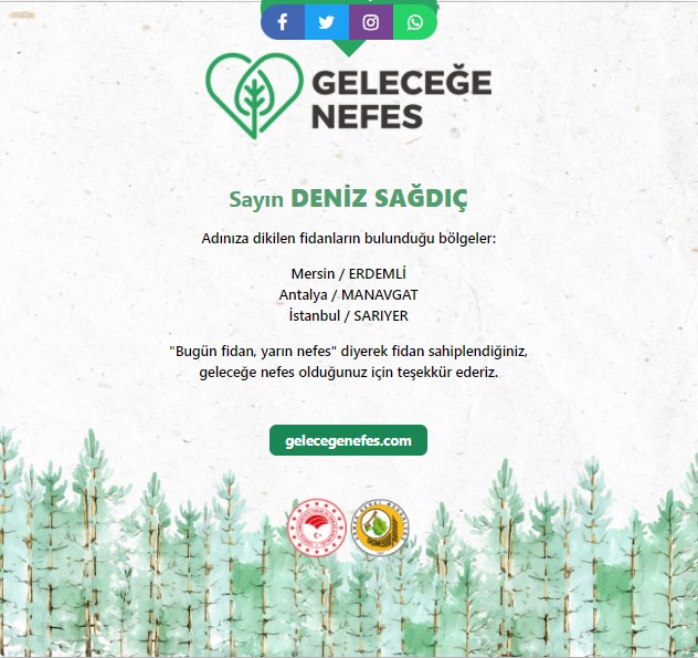 Katılımcımıza teşekkür olarak, Cumhurbaşkanlığımız himayesinde, Türkiye Cumhuriyeti Tarım ve Orman Bakanlığı ile Orman Genel Müdürlüğü'nün koordinasyonunda gerçekleştirilen “Geleceğe Nefes” başlıklı fidan sahiplendirilmesi kampanyası kapsamında, Sayın Deniz Sağdıç adına, Mersin – Erdemli, Antalya – Manavgat ve İstanbul – Sarıyer olmak üzere 3 ilimizde birer fidan ALKÜ Sanat ve Tasarım Kulübü tarafından sahiplendirilmiştir.